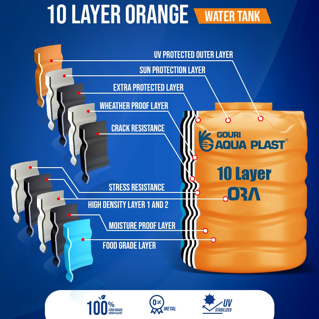 - Gouri aqua plast 10 Layer Orange Water Tank is ideal for households requiring a reliable and hygienic water supply for daily use.